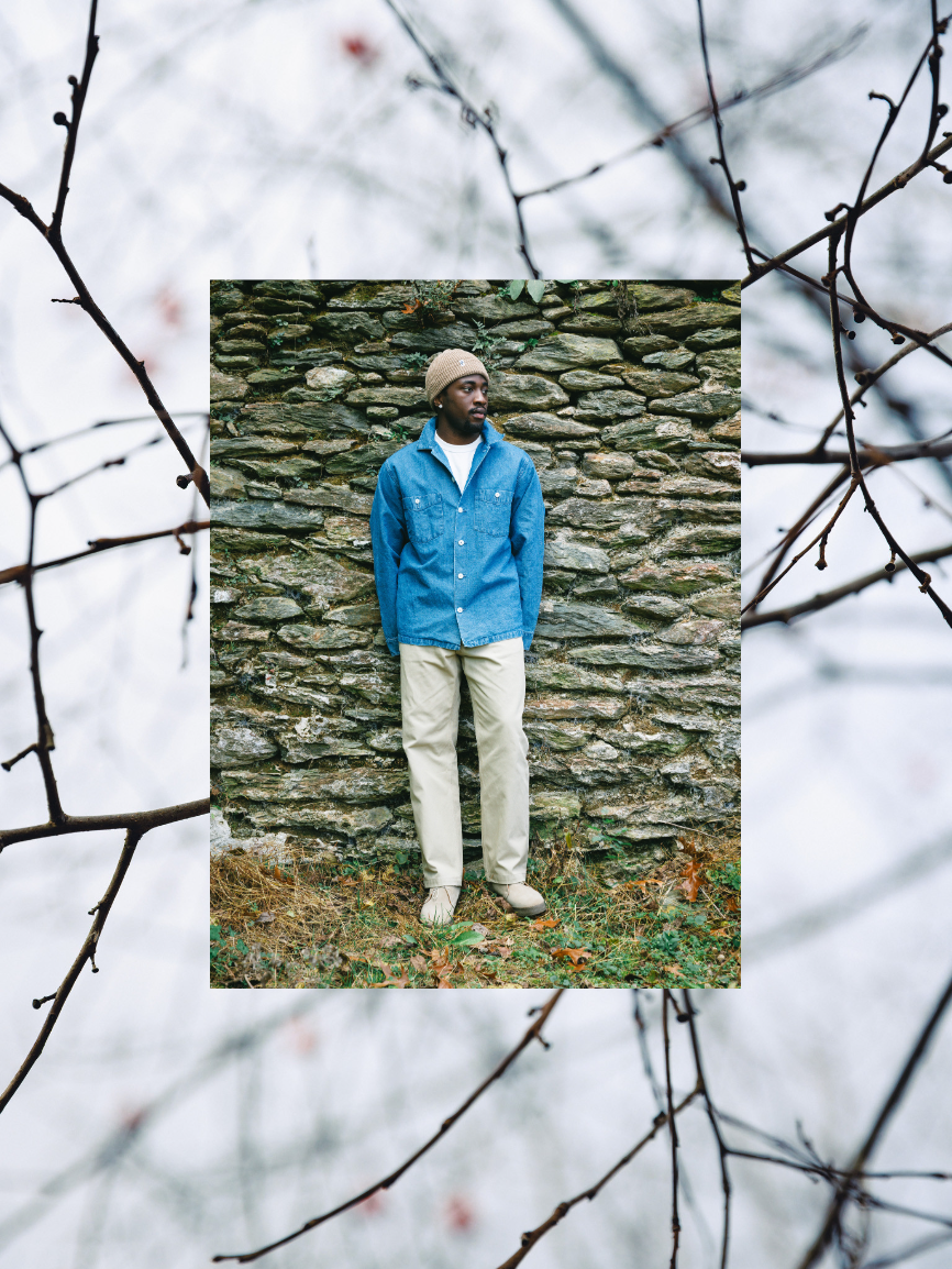 Cotton Linen Chambray Overshirt, Cavalry Twill Pant, Merino Cardigan Stitch Beanie, Sanders Hi-Top (Coming Soon)