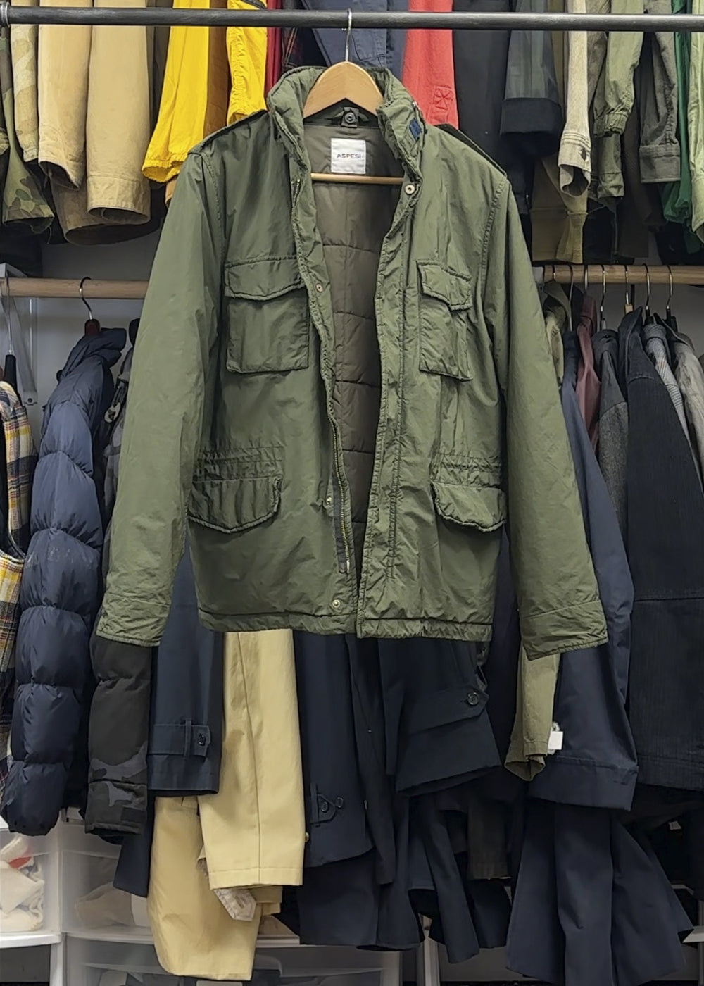 A piece from Jacob's, our co-founder, personal collection. Italian-made military-inspired jacket with a removable liner. 100% Polyester.Measurements:Chest – 23”HPS – 28.5”