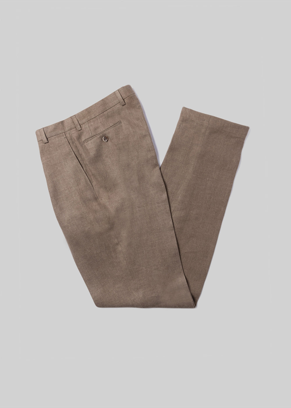 In a soft, brushed finish, our French Linen fabric made up into an outstanding pair of tailored trousers for the matching jacket. For the spring-summer season, we especially appreciate the way a single reverse pleat accentuates the natural drape in the silhouette.