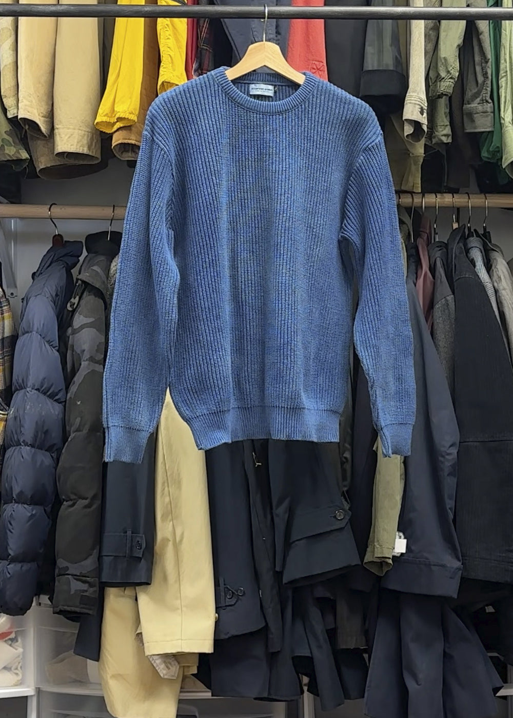 Our Shaker Sweater changed a good bit this season, but this is one from the archives that we'll always remember fondly. Indigo dyed by hand in Lancaster, PA. 100% cotton.Measurements:Chest – 22”HPS – 27”