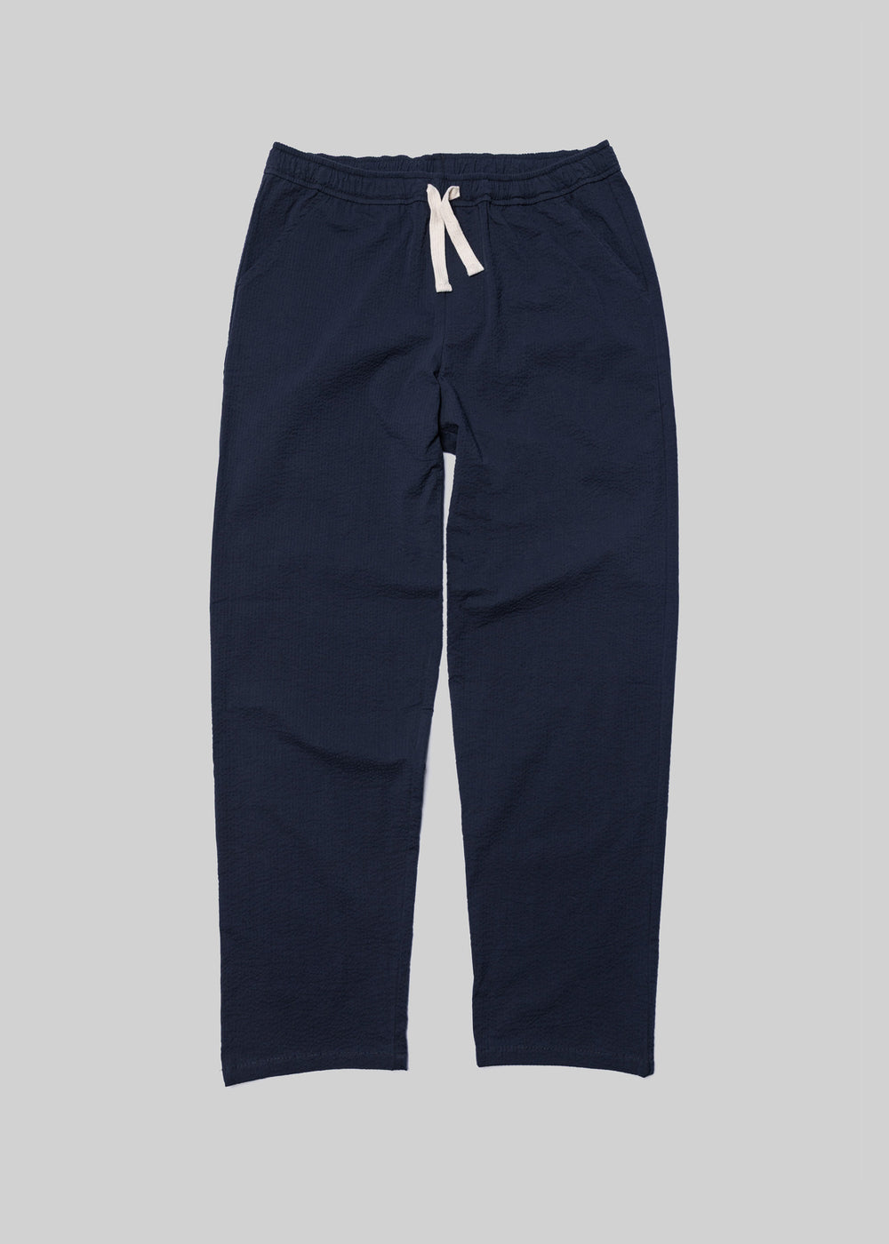 Designed as a warm-weather trouser with the comfort of a stay-at-home pant, it balances casualwear with the elevation of tailored garments. They drape light on the body with a crisp appearance, made from our breathable cotton-blend seersucker fabric with a subtle railroad stripe.