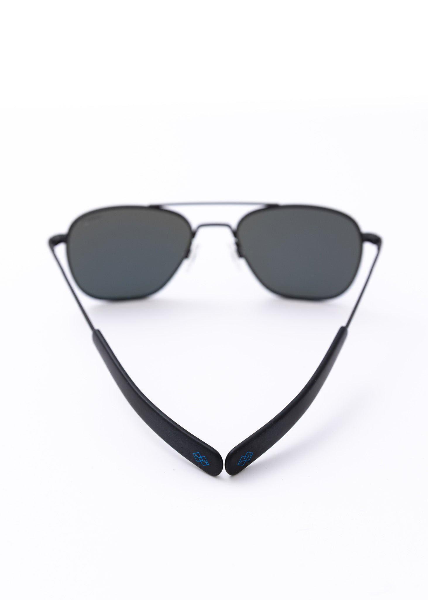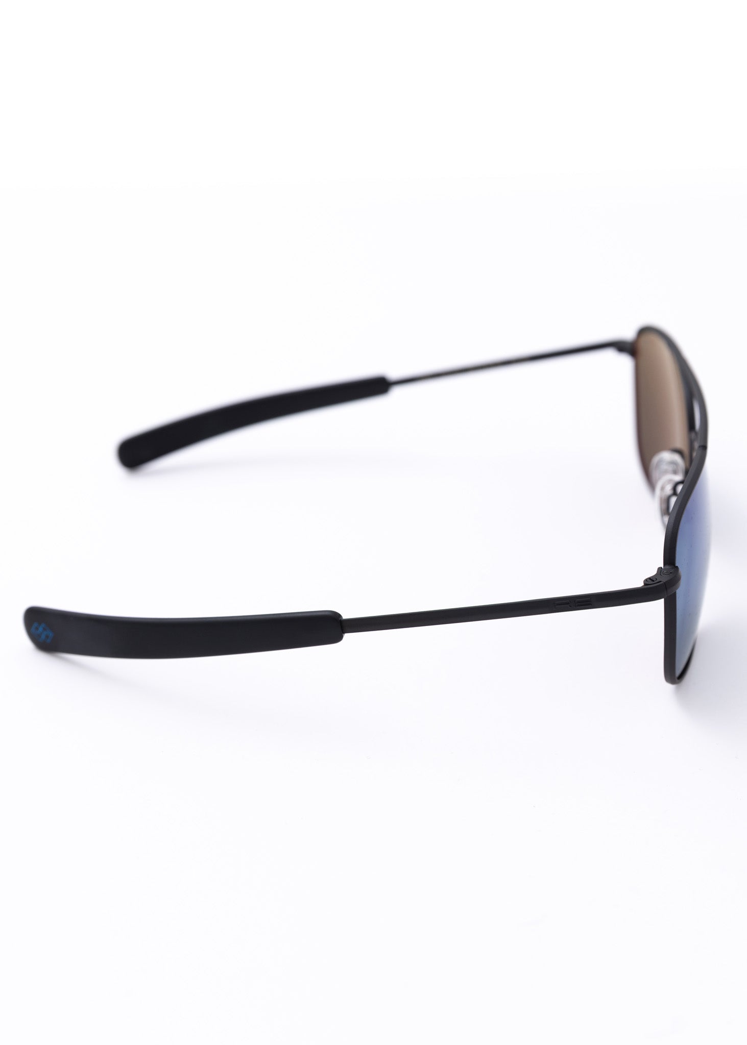 - Matte black Bayonet temple tips specially designed for comfort under headgear, with a metallic blue 1973 logo.