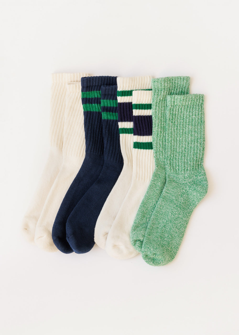Includes: The Solids in Natural | The Retro Stripe in Navy/Kelly Green | The Marls in Kelly Green | The Retro Double Stripe in Navy/Kelly Green