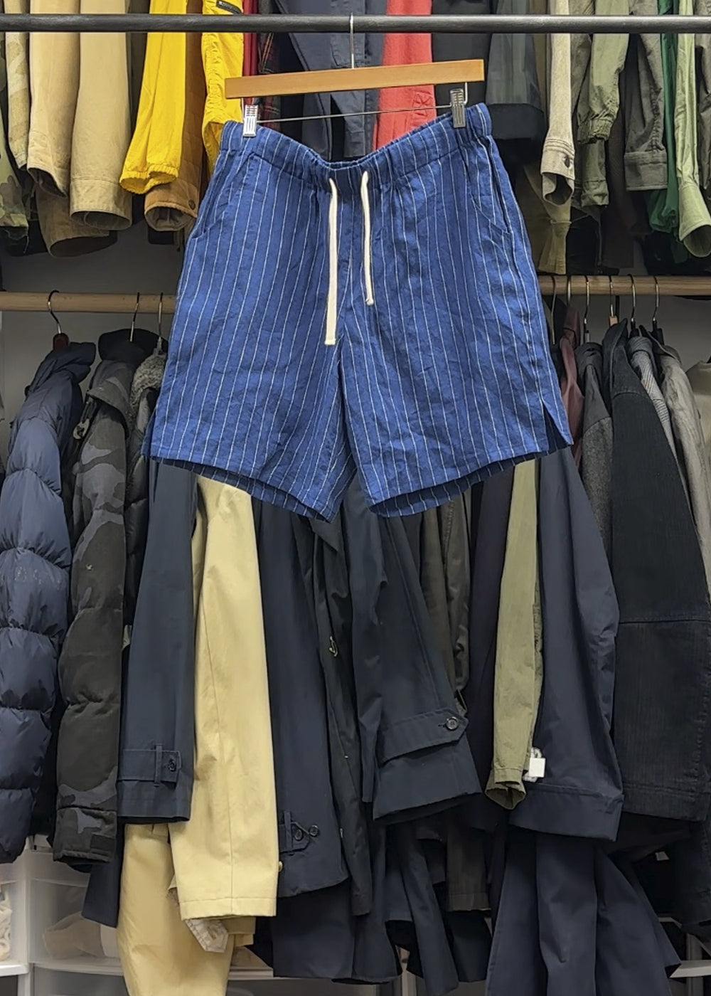 Linen is one of our favorite fabrics to find variations of. This striped version never made it to production, but the color always caught our eye. 100% linen, cut and sewn in Los Angeles.Measurements:Waist – 34”Inseam – 7”